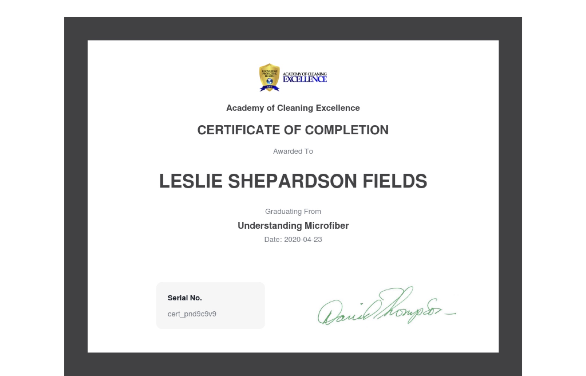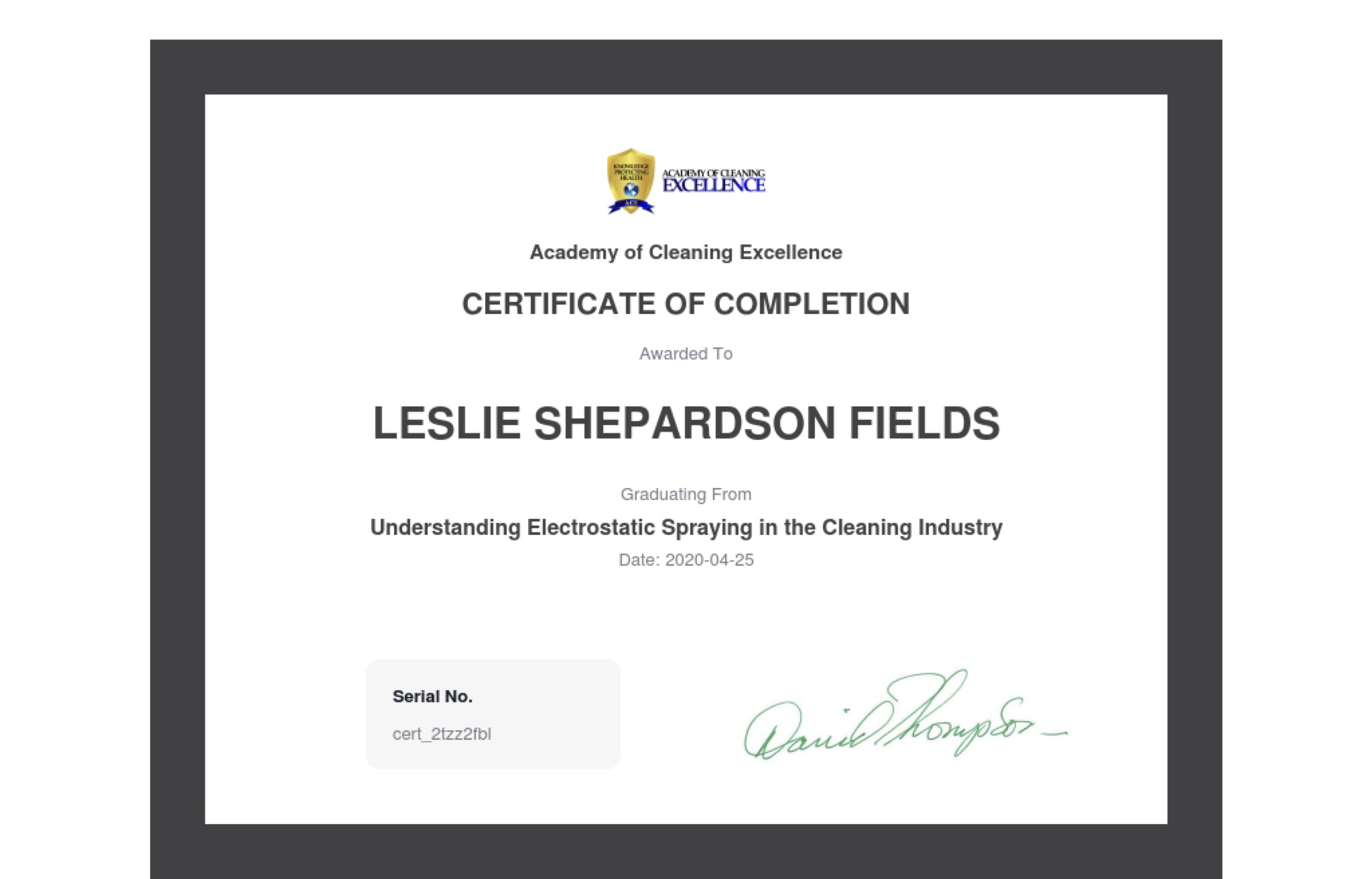 Leslie completed training with the Academy of Cleaning for both their “Understanding Microfiber” and “Understanding Electrostatic Spraying in the Cleaning Industry” courses in April 2020. She has implemented this knowledge in our new, multi-pronged, coronavirus-centered training for our employees as we prepare to resume residential cleaning service.