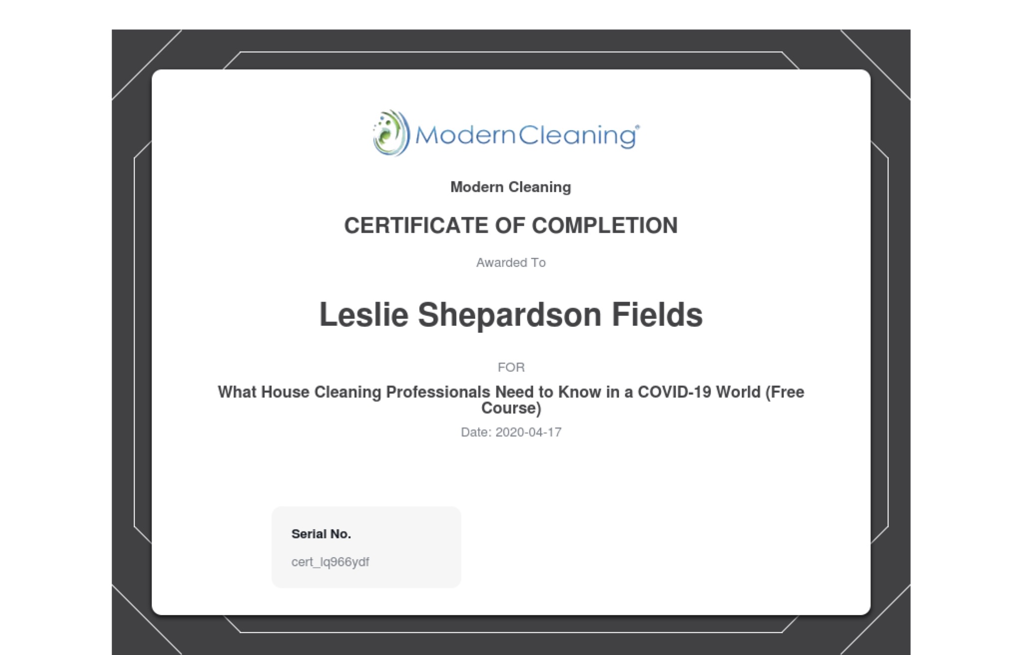 Leslie earned her certification from Modern Cleaning’s training course, “What House Cleaning Professionals Need to Know in a COVID-19 World” in April 2020.