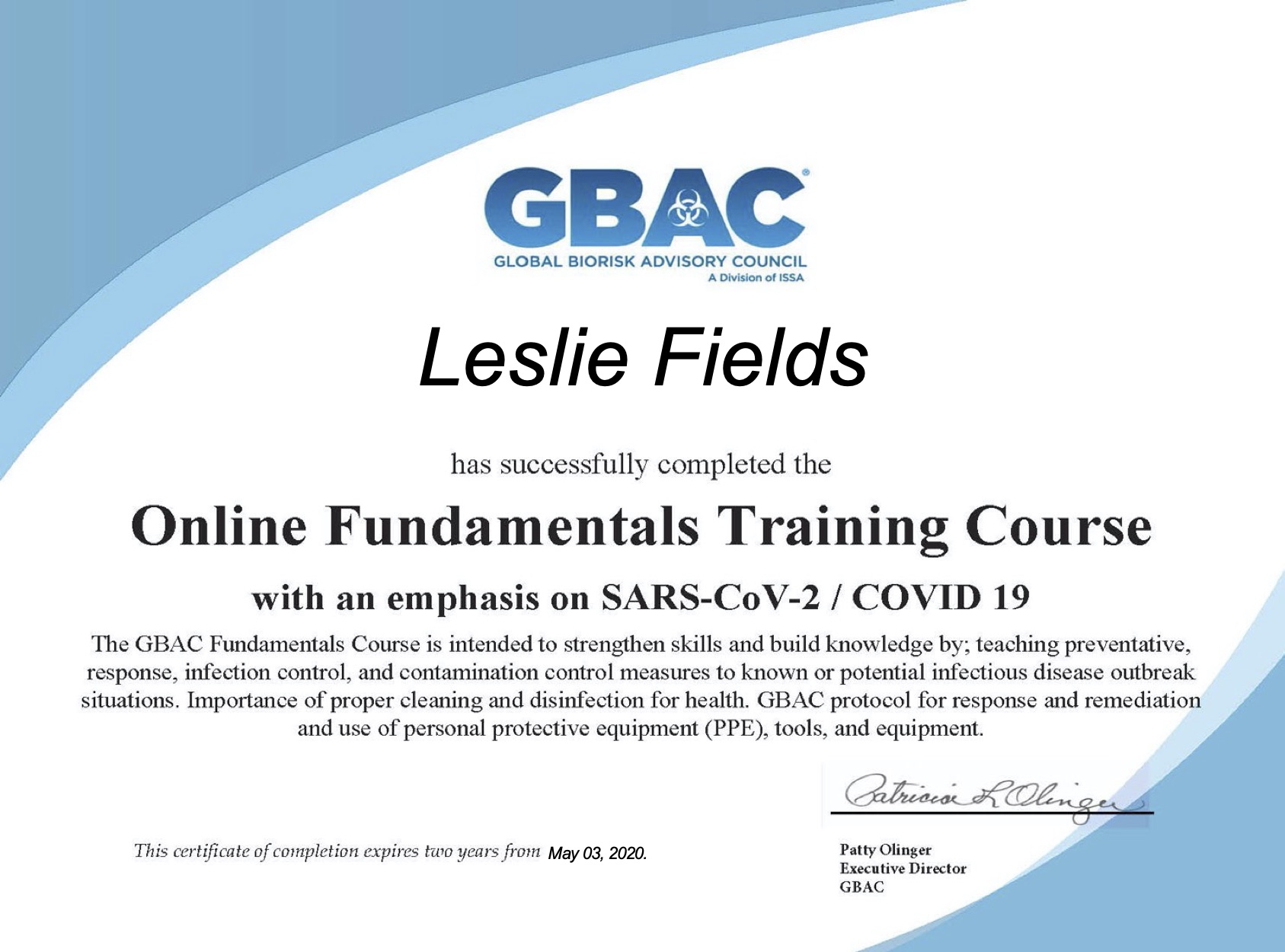 Leslie completed certification for GBAC’s “Microbial Warrior Workshop Training” after completing the “Fundamental Training Course with Emphasis on SARS-Cov2 and COVID 19” in May 2020.