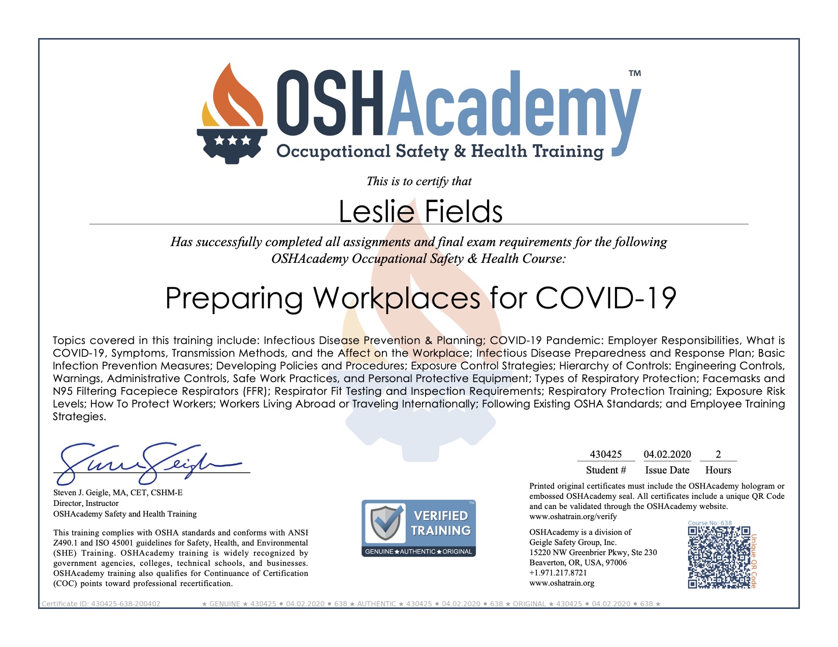 Leslie completed OSHAcademy’s “Preparing Workplaces for COVID-19” course in April 2020.